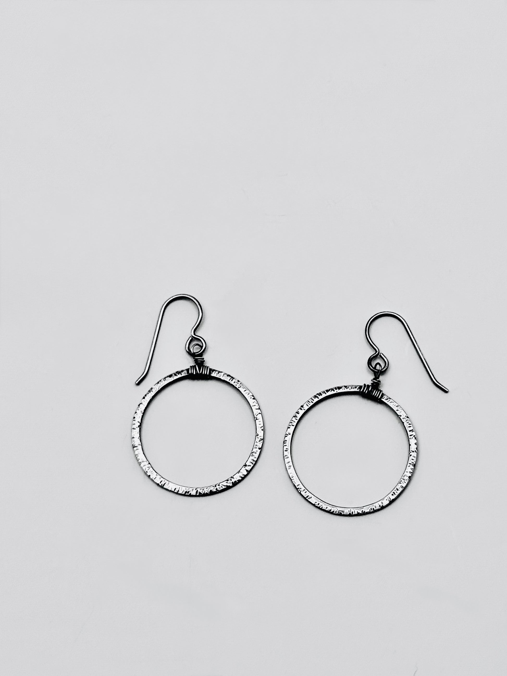 These sterling silver hoops are hand-formed and wire-wrapped for a one of a kind finish. Each pair is given a rough, organic texture and completed with a dark patina that brings out the depth and character in the silver The result is a modern yet earthy design that feels both bold and wearable.